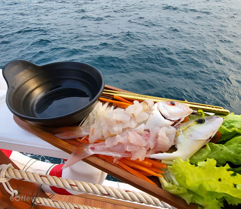 - ปลาที่ตกได้ ทีมงานนำมาเเล่ให้ทานกันสดๆ ทานไม่หมดห่อกลับไปบ้าน ทีมงานมีจัดเตรียมน้ำจิ้มซีฟู้ด เเนะนำให้จองกิจกรรมนี้ล่วงหน้า