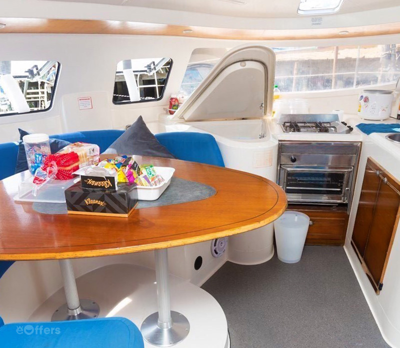 - Food, beverages, snacks, seasonal fruits, drinking water are served onboard and facilitates all equipments for snorkelling, SUP, and dinghy